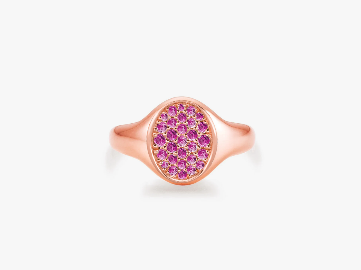 Der Petite Posh Signet Pinky Ring Crown schmückt den kleinen Finger mit königlicher Anmut. Feine natürliche pinke Saphire leuchten auf der Oberseite wie eine Krone, ein edles Symbol für Frauen, die sich selbst ehren.